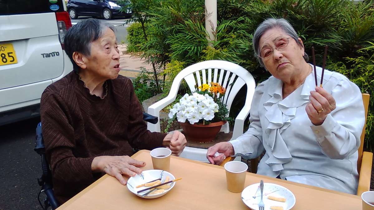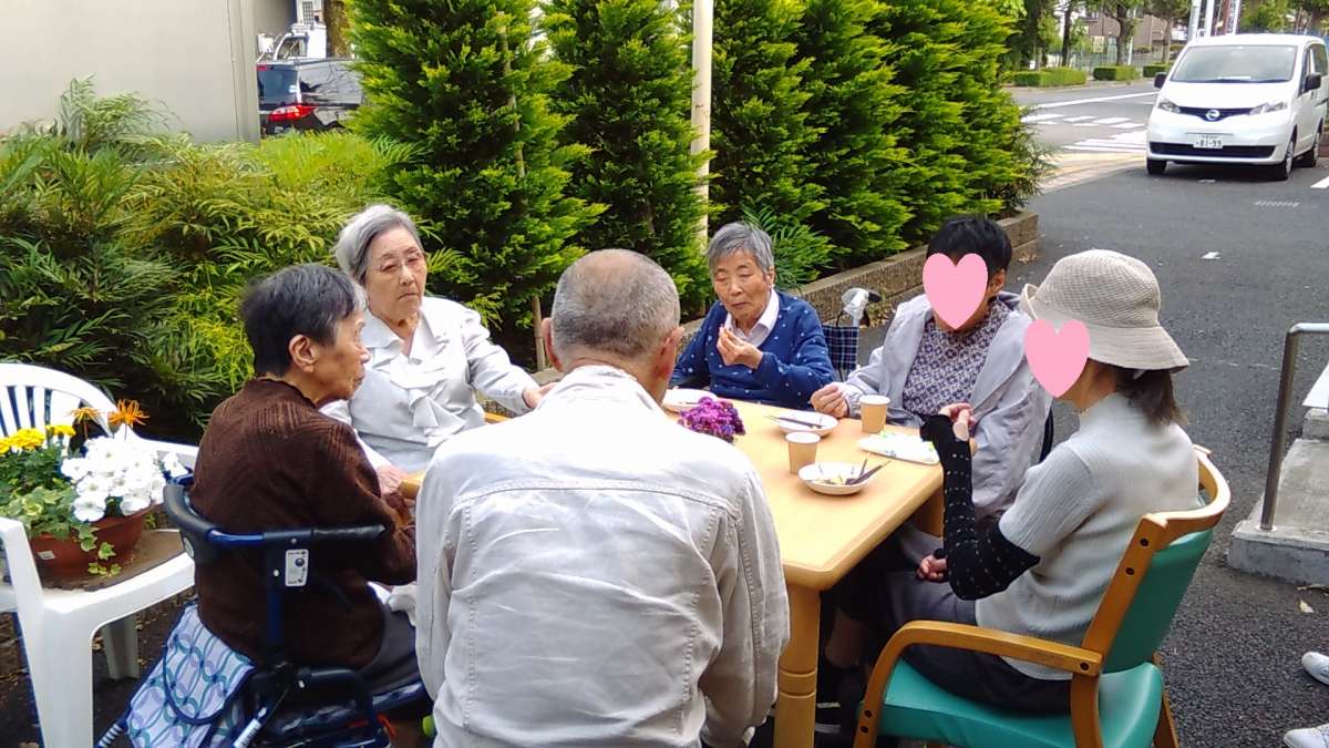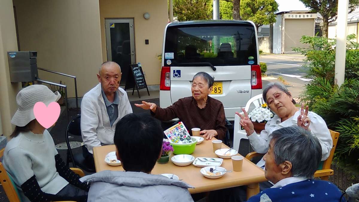 施設の中や、お散歩で行った公園等でおやつを食べたり、お茶をすることはありましたが、施設の前の駐車場でテーブルと椅子を持ってきて、みなさんで初めての場所でお茶を飲むのもいいですね(*^_^*)