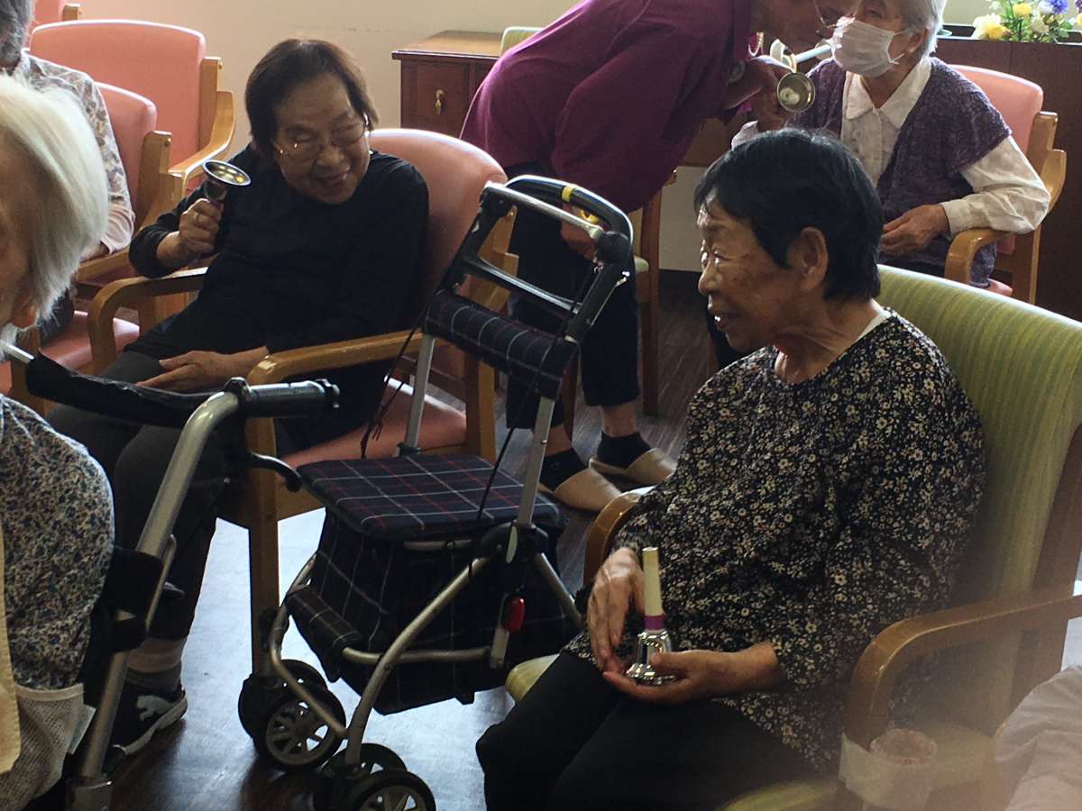 あるご家族様のご厚意により今回の「ハンドベル演奏会」が開催されたのですが、すこや家・北新横浜がオープンして11年・・落語・フラダンス・紙芝居など色々なボランティア様による訪問がありながら、ハンドベルだけは未開催。という事で、北新横浜”初”ハンドベル演奏会が開催されたのでした!普段はレクリエーションにはあまりご参加されないご利用者様も今回は参加され(やはり女性の参加者が大半でした)「見上げてごらん夜の星を」「水戸黄門」などなじみの深い音楽を演奏していただきました♪最後にご利用者様もハンドベルを一緒に鳴らし、心地よい音色が施設全体に響き渡るのでした!