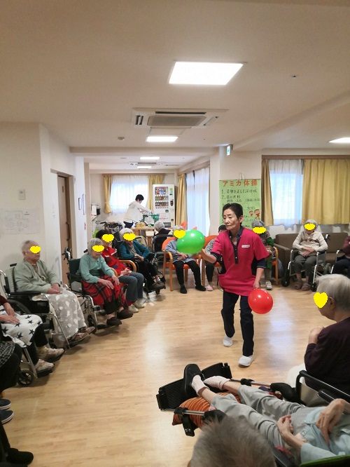 お客様には輪になってもらい、職員が中に入り、風船を落とさないようにお手伝いです🎈