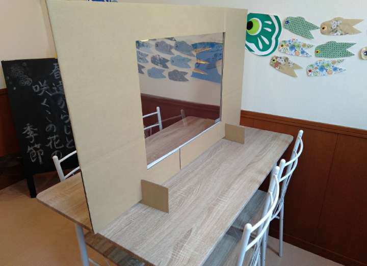面談中のコロナの飛沫感染防止にと、せせらぎのD・I・Y(=自身でやる)大臣こと、看護師の丸山さんがテーブル用の間仕切り(飛沫飛散防止シールド)を考案・制作して下さいました!!!