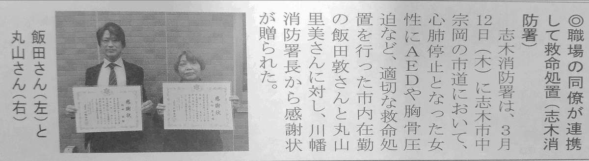 志木消防署は、3月12日(木)に志木市中宗岡の市道において、心肺停止となった女性にAEDや胸骨圧迫など、適切な救命処置を行った市内在勤の飯田敦さんと丸山里美さんに対し、川幡消防署長から感謝状が贈られた。