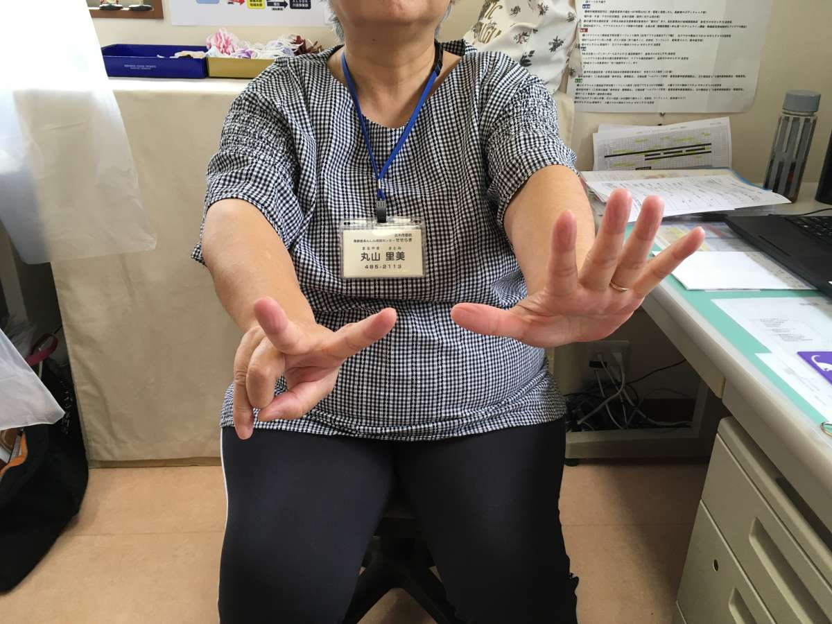 ①両手ともグーパーグーパーを10回行います。握る時、開く時を意識して行いましょう。