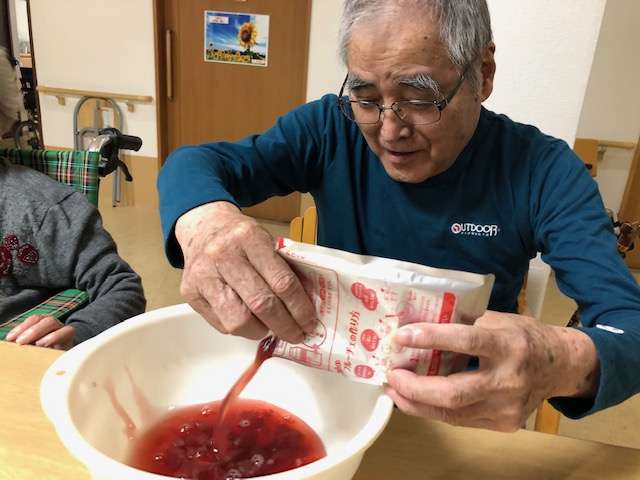 そこで職員同士、普段の生活の様子の情報を共有し合いました。K様が不安な気持ちにならないために、少しでも心が落ち着くようなことは何なのか。根本的なことから掘り下げいつものケアに加え日常プラスαのケアを心掛けました。ご家族と電話をしたり、なるべく一人でいることが無いように職員の声掛けを多くしていました。そこで提案された一つに、大好きな食事をイベント化することで少しでも気持ちを明るく楽しく過ごしてもらおうというものでした。