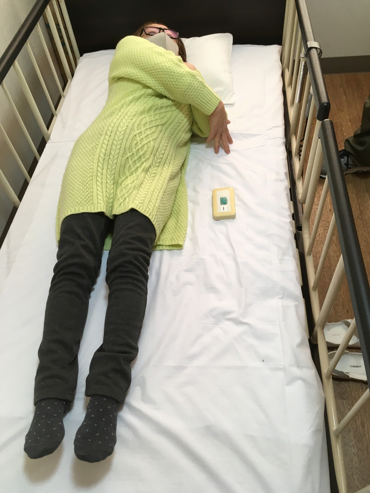 これも同じように左側の麻痺を想定しナースコールが届くか分からない場所に置きます。上の写真も同じですが4点柵にし降りれない様にされています。