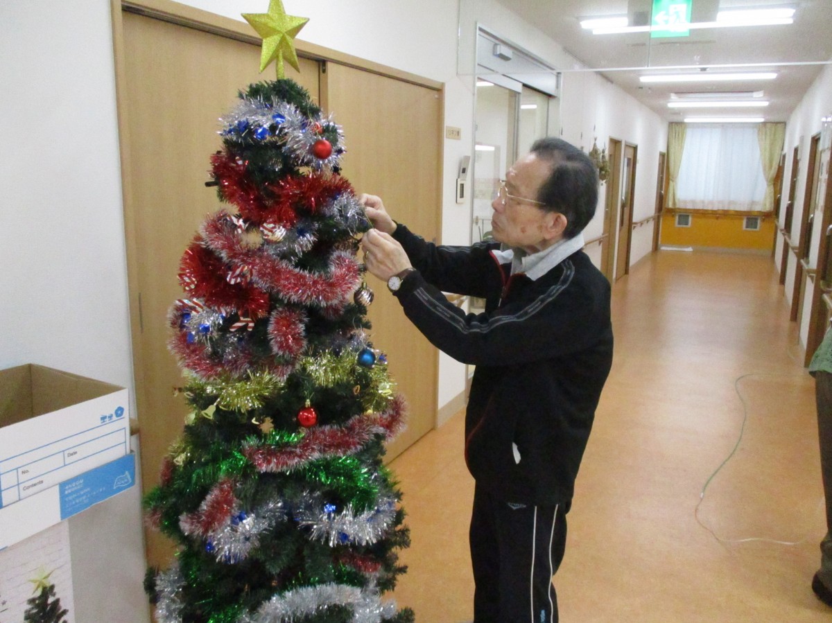12月2日、みんなの家・久喜のあるフロアではクリスマスツリーの飾り付けを行いました。 利用者の皆様にも手伝って頂きました。