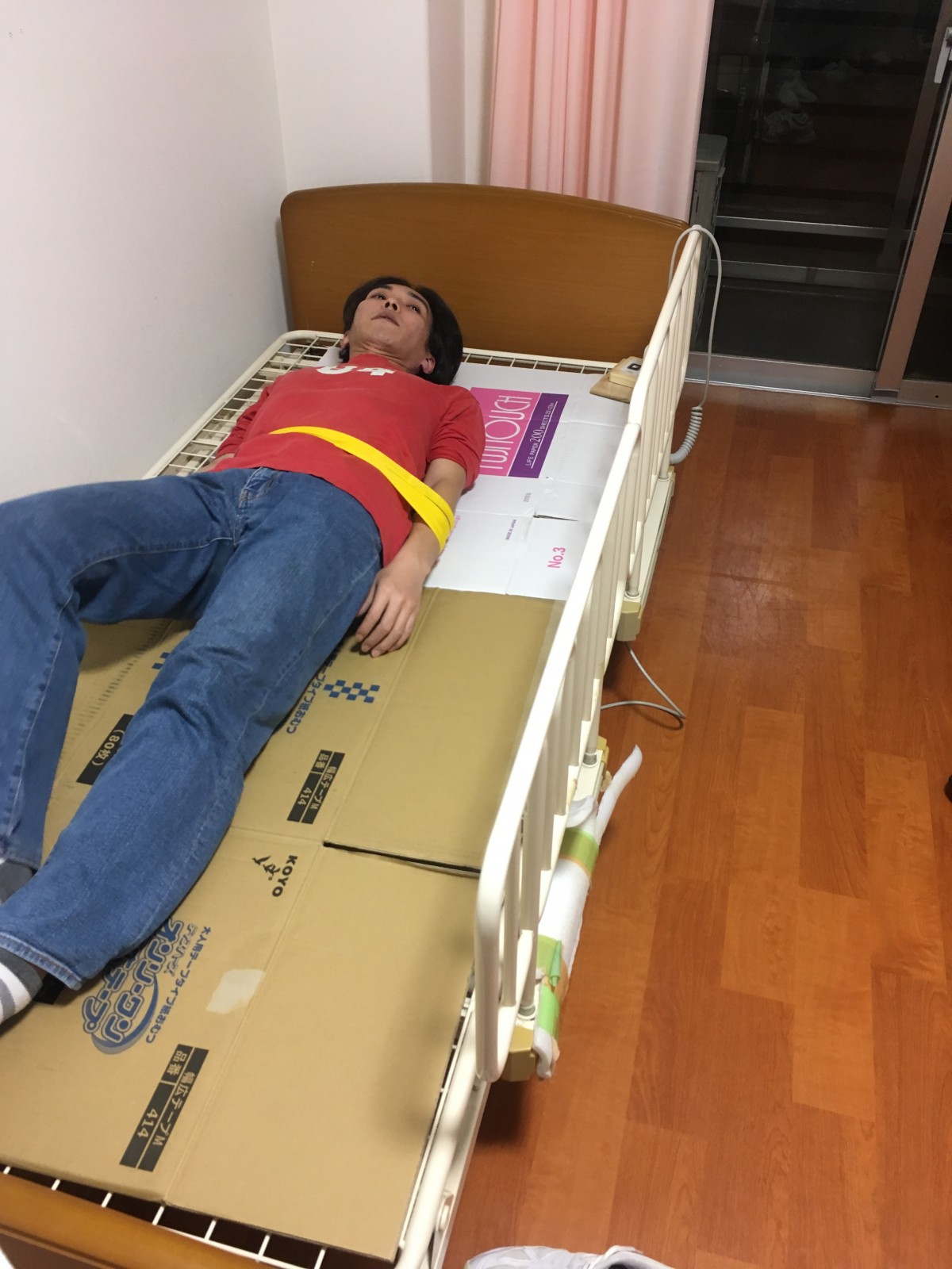 ガムテープ・段ボールと見栄えは悪いですが、不自由な方にナースコールを置いただけでも、