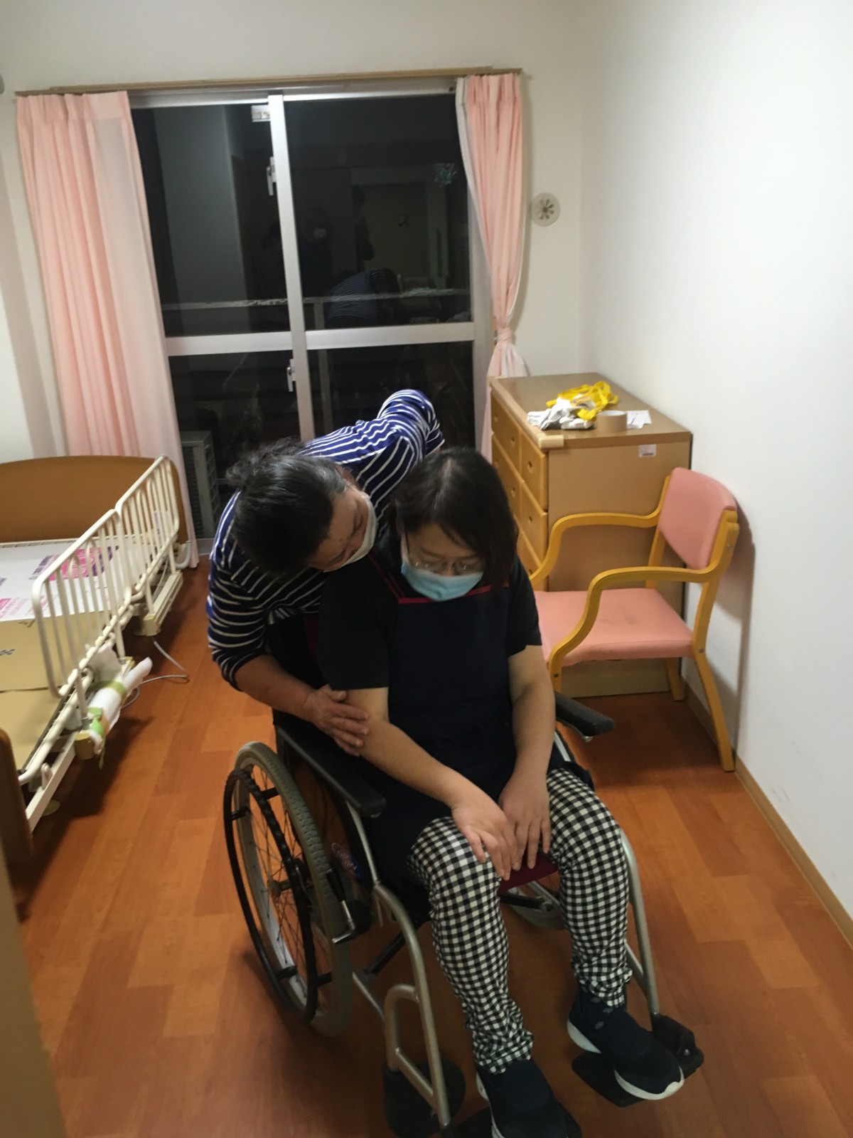 ご利用者様がマヒがあり、麻痺側に4点柵・ナースコールを置いて職員を呼び出してもらう体験を行いました。