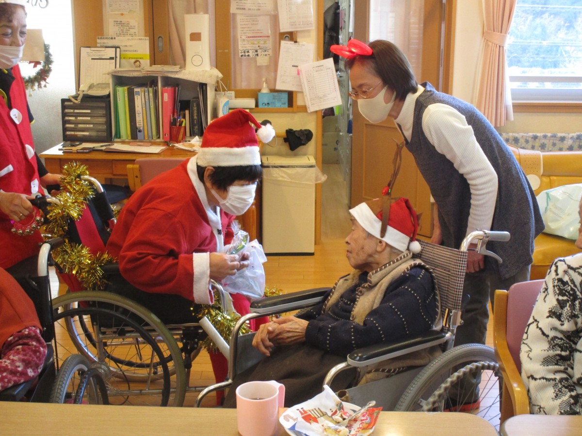 ご利用者様に1人ずつ声をかけながらクリスマスプレゼントを手渡しすると、皆様パァーッと嬉しそうな顔で「ありがとう(^^)」と喜んで下さいました♪