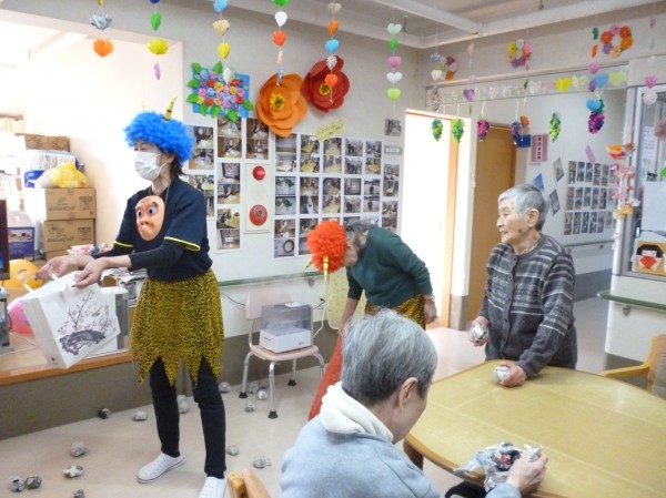 南中野でも豆まきを行いました~( *´艸`)入居者様も職員もノリノリで豆を鬼にぶつけハッスルしましたよ~( *´艸`)