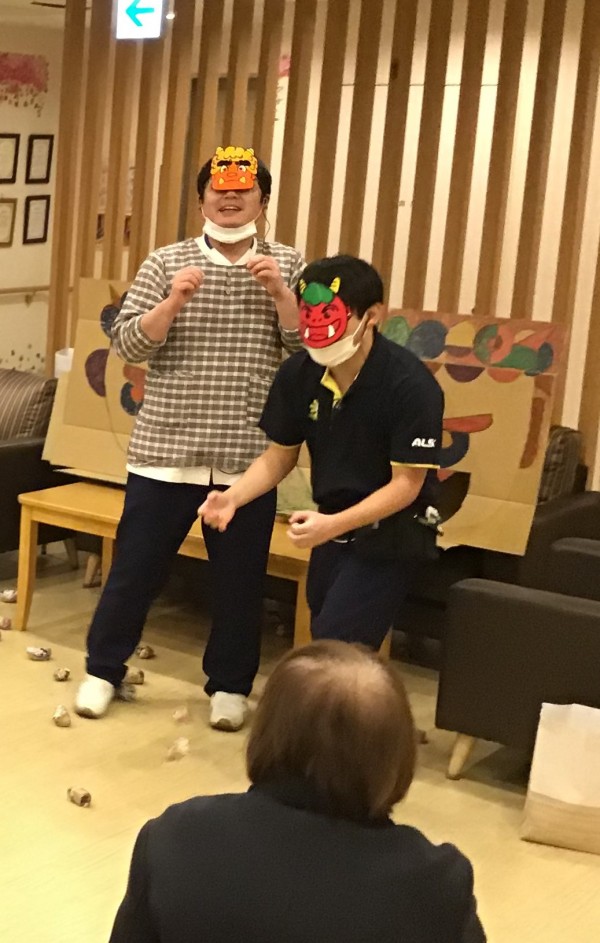 ケアスタッフも鬼役に手を挙げて、看護師に混ざって、皆様からの豆を浴びていました。