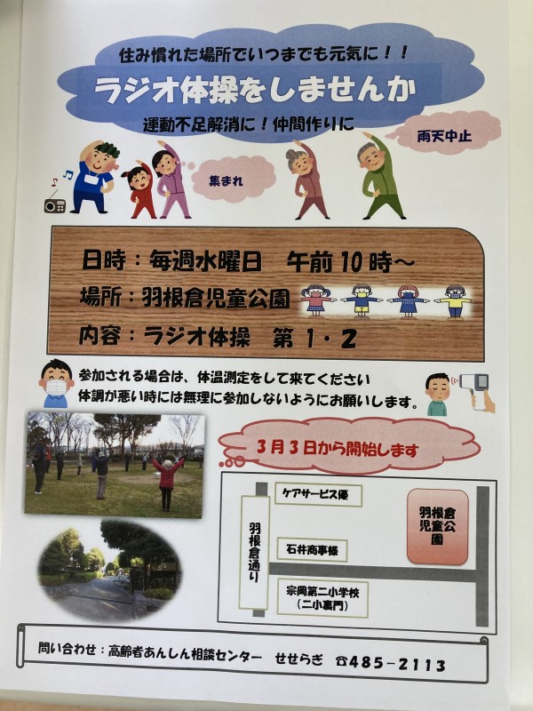 3月3日(水)10時から毎週水曜日羽根倉児童公園にてラジオ体操第1,2を行う事になりました。