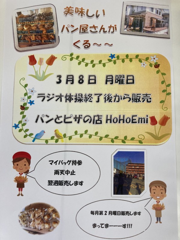 また、次回のせせらぎラジオ体操後(3月8日(月))にまた、【パンとピザの店HoHoEmi】のパン屋さんが来ていただけることになりました。