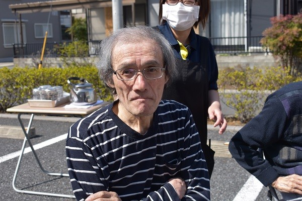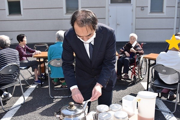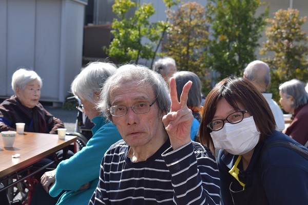 部屋にいても暗いから外でお茶を飲みましょう!!