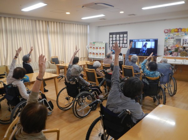 参加されたご利用者のみなさんは、リモートでテレビに映し出されるインストラクターを食い入るように見つめ、ヨガの呼吸と動きを学んでいきました。