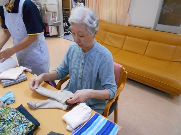 洗濯物を乾かした後、入居者様に畳むのを手伝っていただいています。