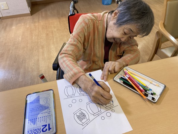 夏祭りに向けて、今回は夏まつり用の塗り絵をして頂きました。