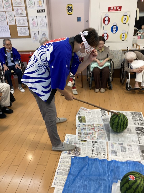 夏祭りの際には職員も日ごろの職務を忘れて皆様と共に楽しみました。スイカ割りは職員も体験しました。しかし、なかなかスイカに当たらず、思いのほか難しい様子です。上記写真は職員がスイカ割りに挑戦するが、スイカに棒が当たらず悔しがっている様子。