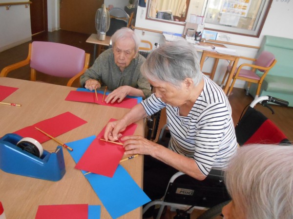 赤と青の厚紙を半分に折り、手持ちをつけて旗作り