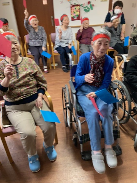 レクの時間に作成した「赤・青の旗」を使い、指示された色の旗をあげます