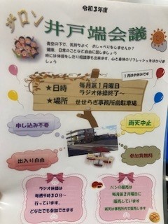 本日、11月1日(月)より【サロン井戸端会議】が毎月第一月曜日せせらぎのラジオ体操終了後に開催いたします。