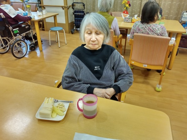 11月25日にS様のお誕生日をお祝いしました!おやつの時間にカットフルーツと、手作りのサンドイッチをご用意しました。S様に「お誕生日おめでとうございます。歌を歌いますね」とお声掛けするととても喜ばれていました。