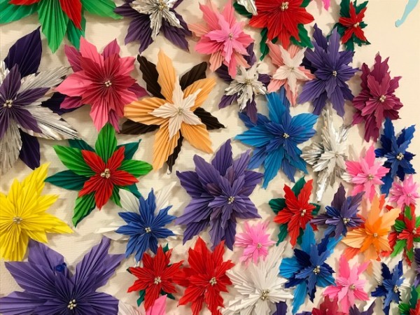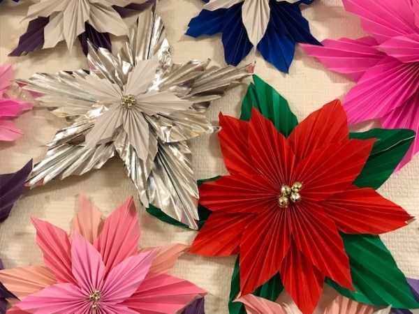 折り紙でポインセチアを折ってクリスマスツリーを作りました。