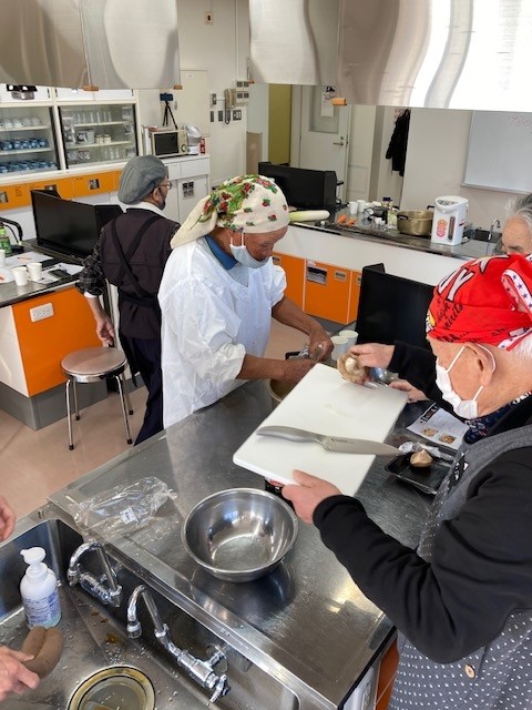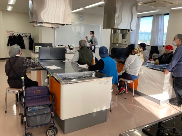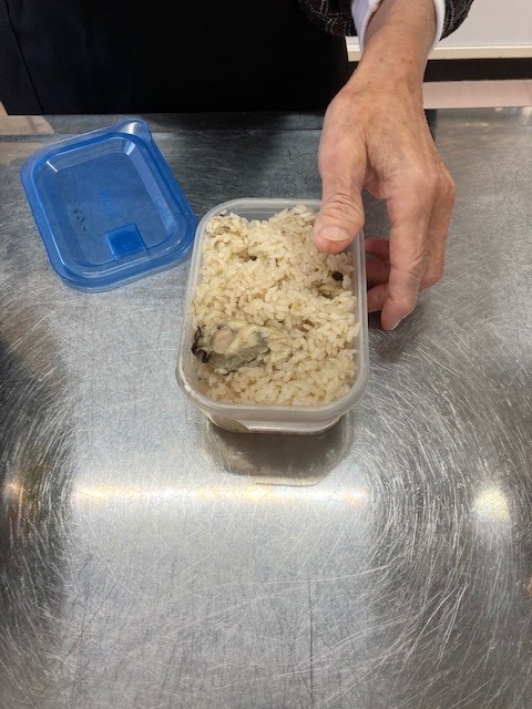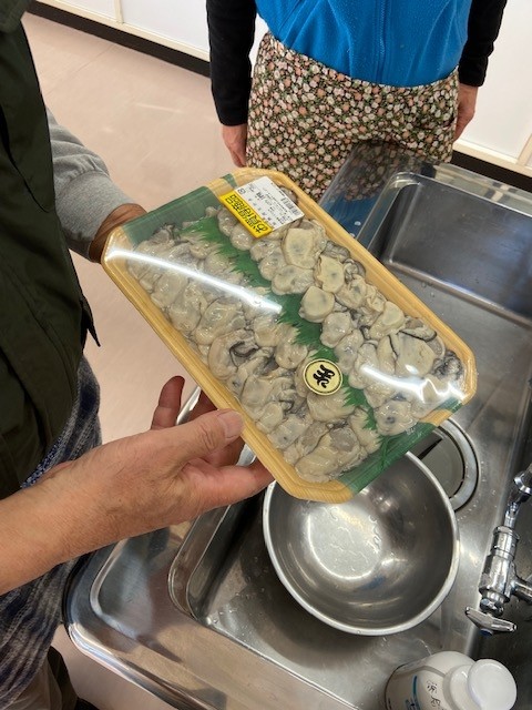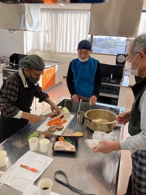 カジオス代表尾上さん、6名の参加者の方と、近くのスーパーで待ち合わせお買い物からスタートしました。献立は事前に尾上さんが考えて下さった「牡蠣の炊き込みご飯」「根菜の煮物」「お浸し」の3品です。各々総合福祉センター調理室まで移動し、調理のポイントのみ確認、切り方も味付けも考えながら行いました。ポイントは、あまりゴミが出ないように皮ごと調理、全て調味料はめんつゆのみ。味は自己責任(汗)。2グループに分かれ調理開始。皆さん自ら役割を探して動いておられました。時間はたっぷりあるので、お喋りしながら、途中コーヒーやお茶も楽しみ休憩しつつ、3品が完成。