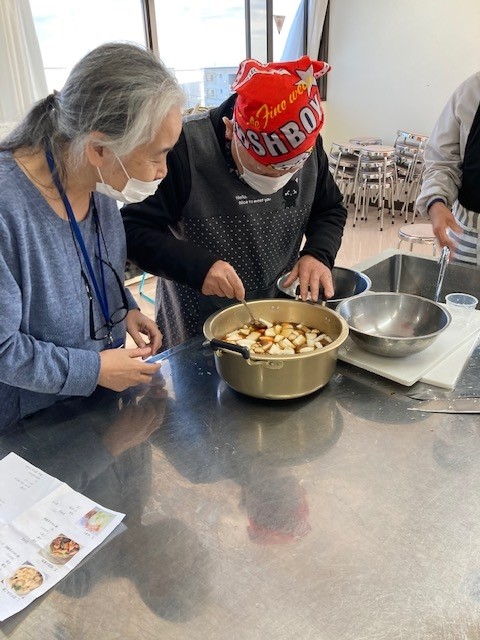 同じ料理なのに、見た目は全くの別料理のようになりました。皆さんからは自然と「いい香りがしてきた」「いい色だな、うまそうだ」「こんな幸せな時間が持てて、貴重な時間だなぁ」「ボケ防止になる」「頭を使わないとできない」「ワンカップがいるなぁ」と口々に感想が出ておられました。完成品は皆さん持参されたタッパに詰めてお持ち帰りです。たっぷりできた為、夕飯にできたのではないかと思います。