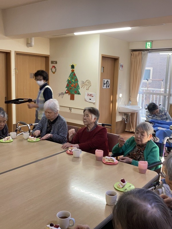 Merrey Christmas! こんにちは、認知症対応対応型共同生活介護、グループホームみんなの家・蕨 クリスマス会 パートⅡ、クリスマスケーキ召し上がり変です。パートⅠは、元、女の子が口の端に舌を出し首を振っているかの有名なお菓子屋さんでケーキを作っていた職人さんだったご利用者様に、ケーキを作っていただいて、皆様にお配りしたところまでのご報告でした。今回は、ご利用者の皆様が名上がられているところのご報告になります。クリスマス会なので、歌を唄ったり、体を動かすのも良いのですが、皆様普段と違うおやつを召し上がられるのが1番楽しい、「おいしいことは、いい事だ!」昔のコマーシャル?さて、皆様どんな表情で召し上がられたでしょうか?