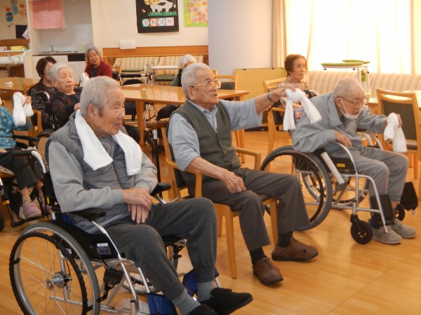 タオルを投げたり引っ張ったり、膝の後ろを通したりと、かんたんではあるものの、みなさん体が温まるほどの運動量。