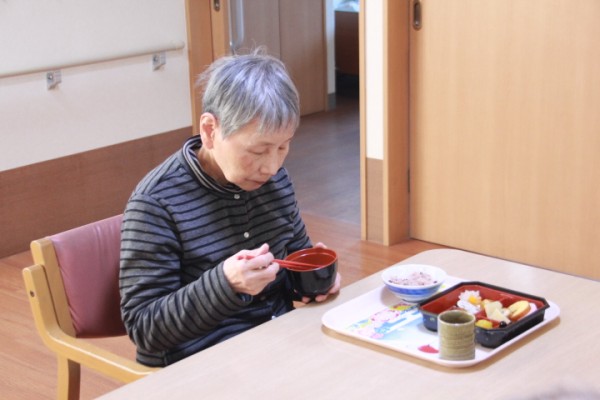 2022年 正月、新年明けましておめでとうございます。認知症対応型共同生活介護・グループホームみんなの家・蕨の新春初本日のランチブログをご覧いただきまして有難う御座います。本日のランチは、お正月らしく、おせちの盛り合わせと、ブリの照り煮・おせちの盛り合わせは、伊達巻、黒豆、チキンロール、ミカンなます、紅白かまぼこ、数の子、栗きんとんでした。汁物は、お雑煮(餅もどき入り)赤飯、おやつに上用まんじゅう(寿)でした。お正月用にお重のような、容器で提供させていただきました。今回は2階のご利用者様の様子だけになってしまいましたが、今年の、お正月料理は、おいしそうな食事が、三が日続きます。ランチだけでなくディナーに鰻の蒲焼なども用意されています。