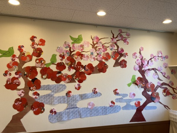 また、同日に壁飾りを張り替えしました。2月の壁飾りは【梅】です。花いっぱいに賑やかな梅がせせらぎを彩りました。