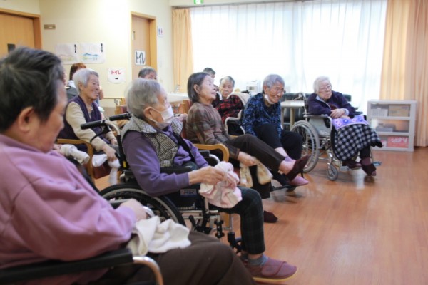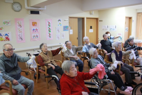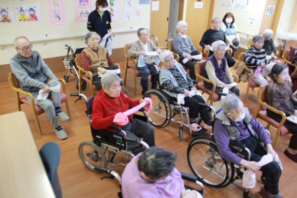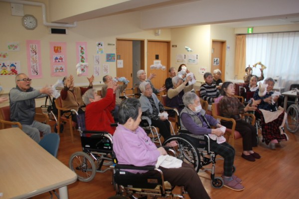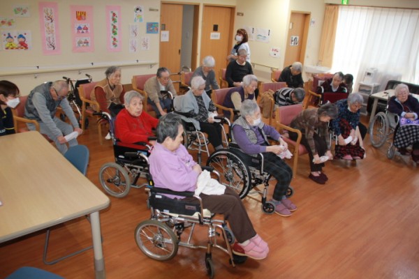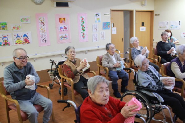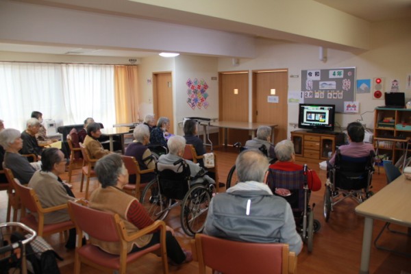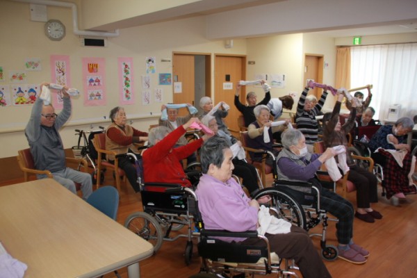 こんにちはこんにちは!認知症対応型共同生活介護グループホームみんなの家・蕨の介護ブログにアクセスいただきまして有難うございます。本日は、久しぶりにAKトレーニング【タオル体操】に参加されたご様子を、ご覧いただきたいと思います。昨日は、関東地方に大雪注意報が出されましたが、積雪ではありませんでした。今朝は、雪かきから始まるのかな?なんて考えながら起きました。ご利用者の皆様は、外で何が起きていようが気にせず、夢中でオリンピックをTV観戦されています。さて、今日はAKトレーニングのタオル体操に参加せれ、体をいっぱい伸ばしていただきました。本日の参加者は17名と職員4名の計21名の参加でした。始まる前にモニターに映る、あちらこちらの施設の皆様をご覧いただきながら、14:00、運動開始、まずは、ストレッチで体をほぐし全身を、徐々に伸ばしながらの運動です。皆様、モニターを見ながら、先生と同じ動作を行いつつほぐしておられました。最後に「雪」の歌を唄いながらタオルを使いながら、伸ばしたり,ちじめたり、笑顔で続けて居られました。皆様は、昼食の前と夕食の前に体操を毎日行っているので、比較的皆様体が柔らかいです。職員の方が固く「ヒーヒー」言いながらやっています。