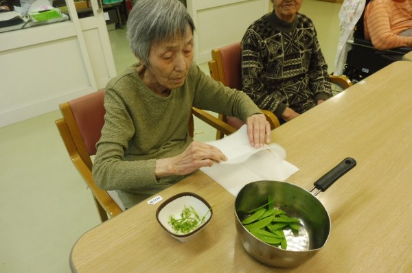 下ごしらえ「きぬさや」のすじとり。