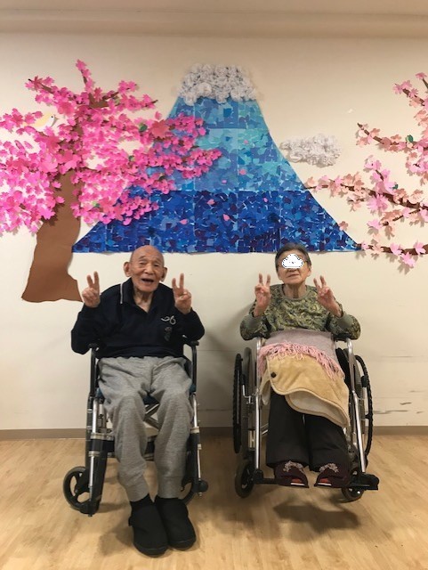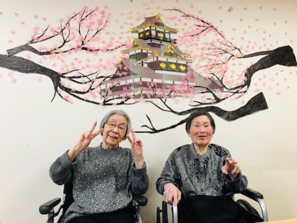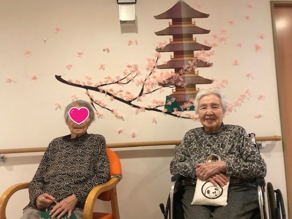 各フロアの廊下に桜の木の下で記念写真を撮りました(^O^)/