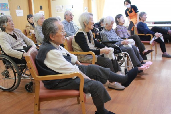 認知症対応型共同生活介護 グループホームみんなの家・蕨です。本日は、AK(あんしん、かんたん)トレーニング【タオル体操】に参加しました。タオル1本で、いろいろな体操ができるので、皆様楽しみにしているAK【あんしん・かんたん】トレーニング【タオル体操】」です。皆様首にタオルをかけ、体をほぐす運動から始め、タオルを肩幅に持ちバンザーイそのまま体を右側に倒しまーす。と言う具合にわかりやすく簡単にストレッチ、後は、タオルを丸めたり、結んだり、膝に引っ掛けて引っ張ったり、絞ったり、握ったり次から次に変化するので楽しく、出来ない事も笑ってごまかして楽しみながら今日も運動しています。