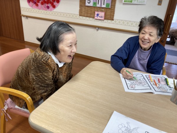 10数年ホームで暮らしている利用者様は「もう何年もやってきたから…」と塗り絵をやらないことが増えてきたんですが、この日は皆さんが塗り絵をしているのを見て、自分から塗り絵と色鉛筆に手を伸ばしていました(#^.^#)