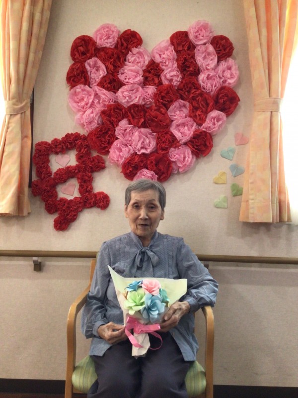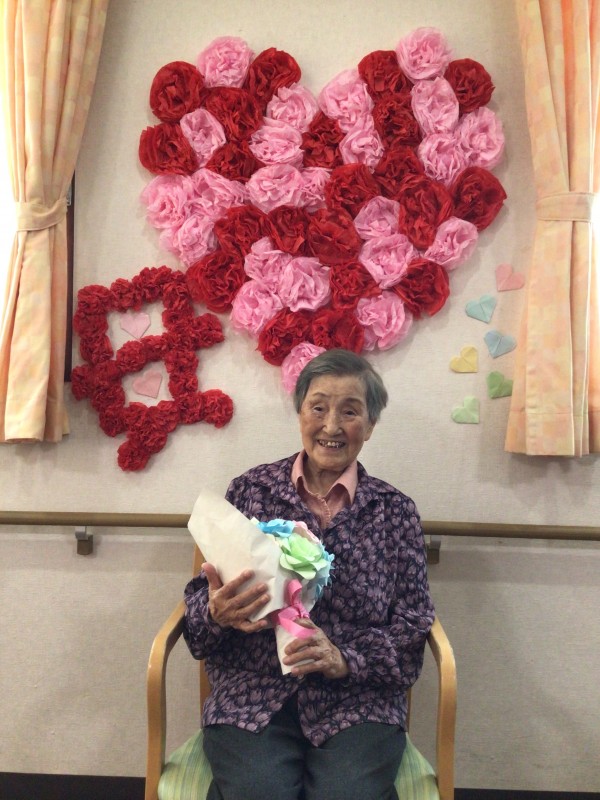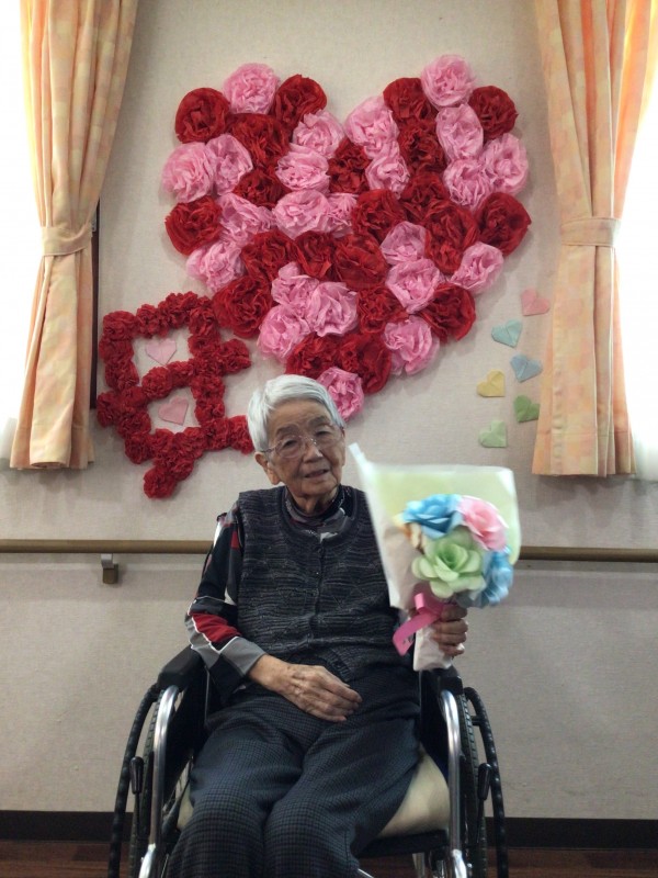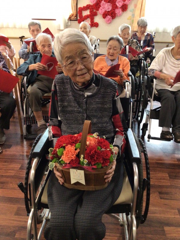 背景、手持ちの花束はスタッフの手作り!繊細な出来の為、強く持つと崩れてしまうので「優しく持ってくださいね」と皆様にお声掛けしましたが、きれいな花束に皆さま興味津々!「きれいね~」とお花をつんつんと触る方もいらっしゃいましたが、それだけ喜んでくださってスタッフも大満足でした(*^-^*)