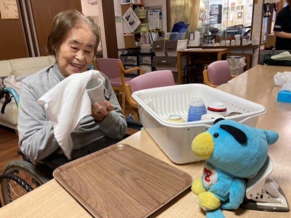僕が食後の食器洗いをしていましたら、ご利用者様のK様とY様がいまして、「お手伝いするよ」とのこと。