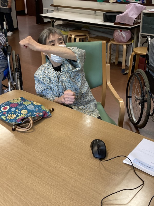 2階の入居者様は身体を動かすのが大好きで、リモート体操の先生のお顔をみると