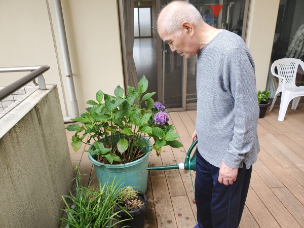 ウッドデッキのお花や野菜が少しずつ育ち、今日もご利用者様に水やりを行っていただきました♪