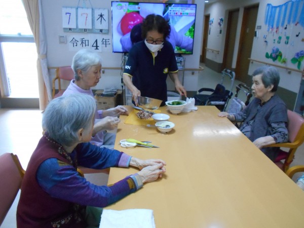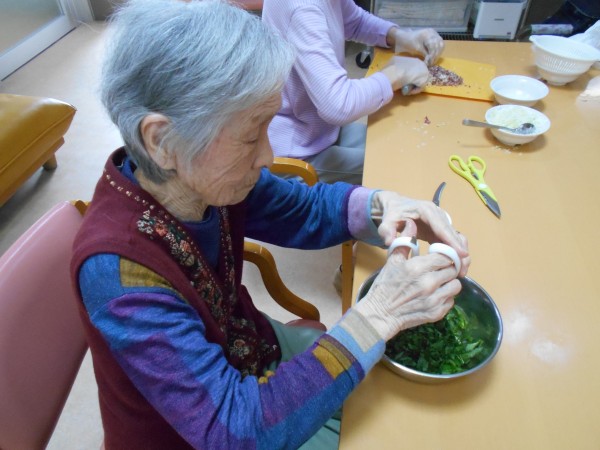 職員と一緒にネギなどを切っていただき、皆様で美味しく召し上がられました。