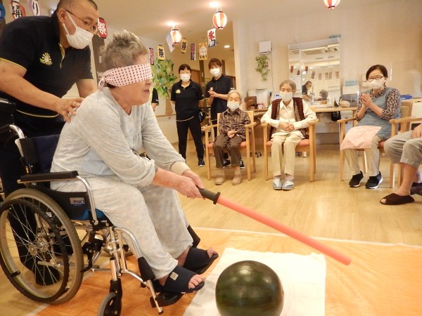 ご利用者さまの皆さん、とっても楽しみにしていた“すいか割り‼”を開催いたしましたぁ\(^^)/