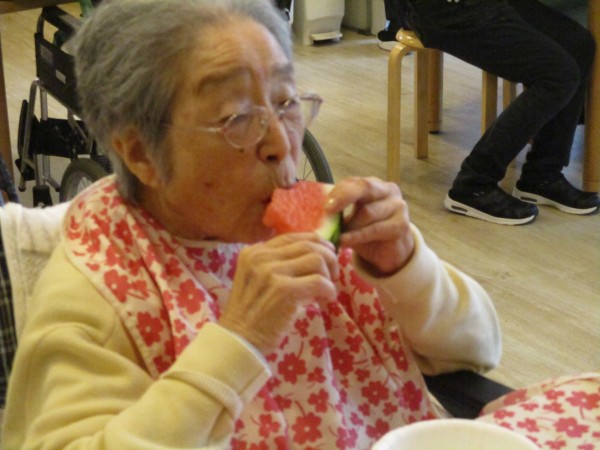 せめて夏を味わっていただきたいと思い、おやつの時間に「すいか」を準備しました