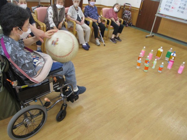 大玉を転がして、10本のペットボトルのピンを倒すゲームです。
