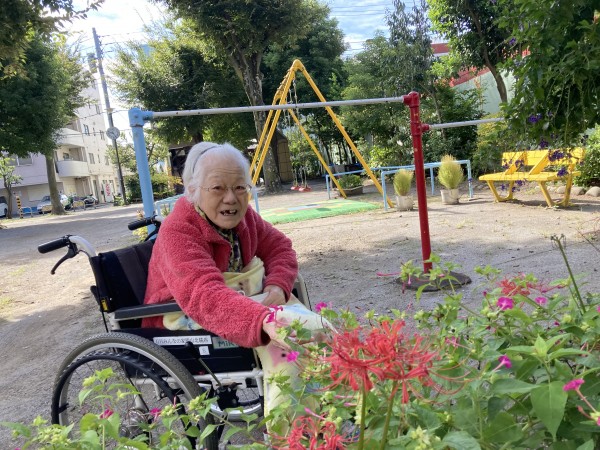 お散歩は職員のテンションも上がります!!なので、こんな笑顔で仲良く記念撮影が出来るのです。こんな時って利用者様と職員という関係性ではなく、お互い人と人としての瞬間。