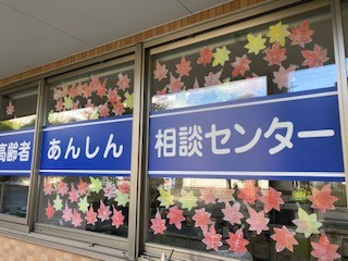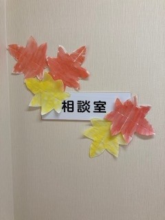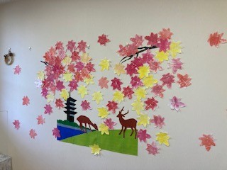 せせらぎの径からも見えるように窓にもたくさんのもみじを貼りました。