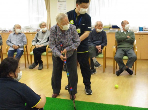今日の運動レクレーションは『パターゴルフ』です!色々な種類のボール10個を使ってホールインさせるゲームです!