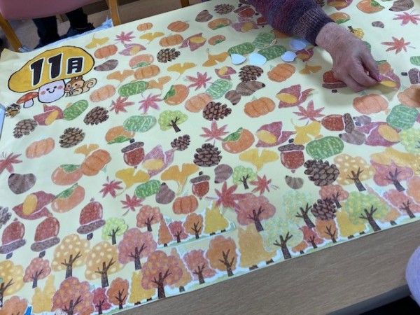 紅葉やイチョウ、栗、芋など秋のものの貼り絵をしました。