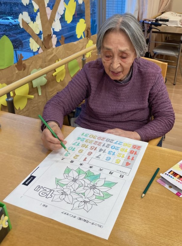 12月のカレンダーの塗り絵をされているところにお邪魔すると、 「ダメよ。上手く出来てないもの」と言われ、